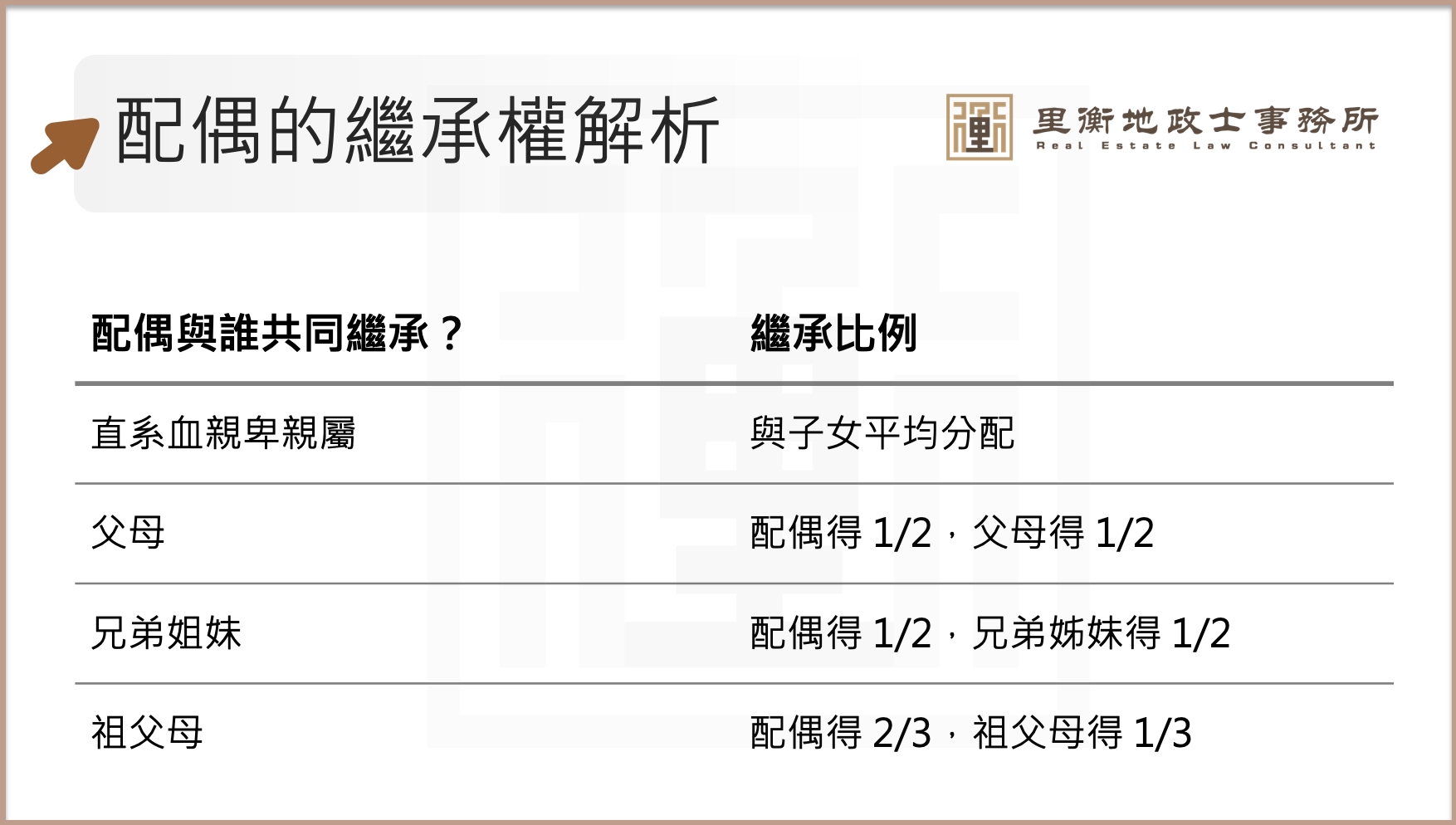 · 與兄弟姊妹 → 配偶一半,兄弟姐妹一半