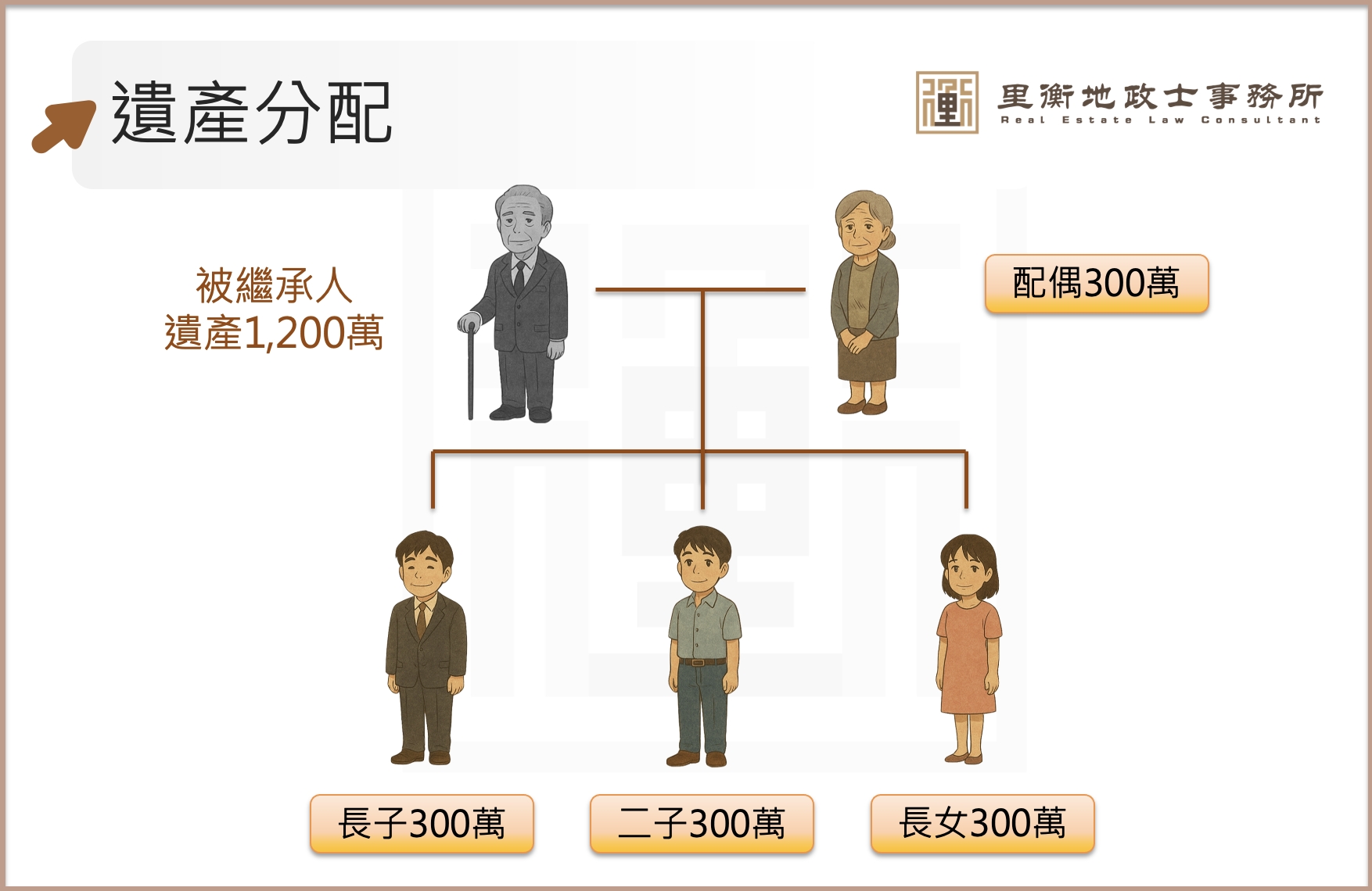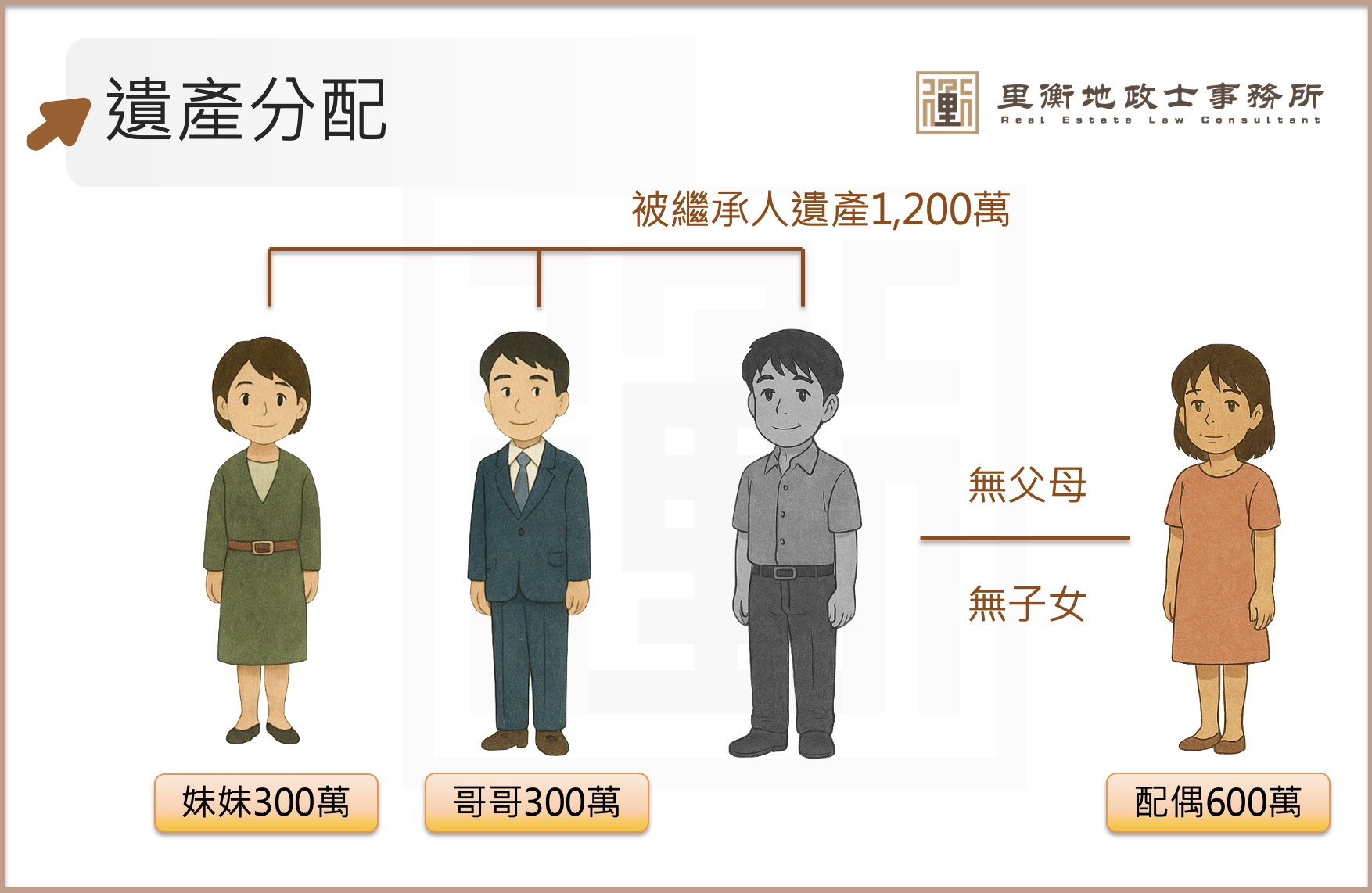 總遺產 1,200 萬元 → 配偶得 600 萬,兄妹各得 300 萬。