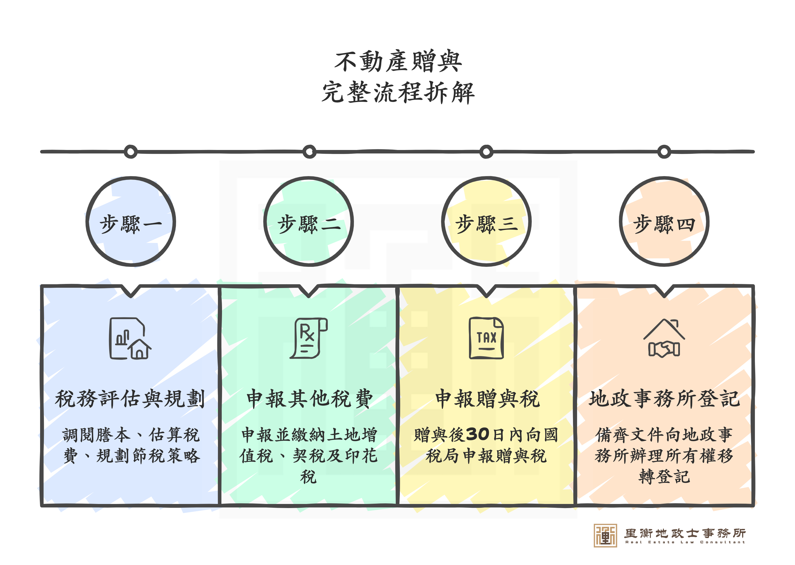 - 特別注意:贈與無法適用「一生一次」或「一生一屋」的自用住宅優惠稅率 (10%),這是贈與相較於買賣移轉的主要成本差異點。